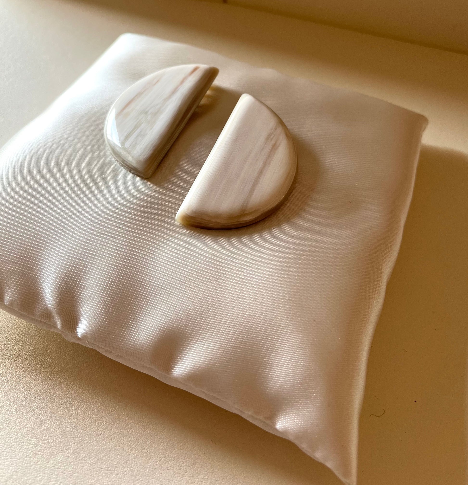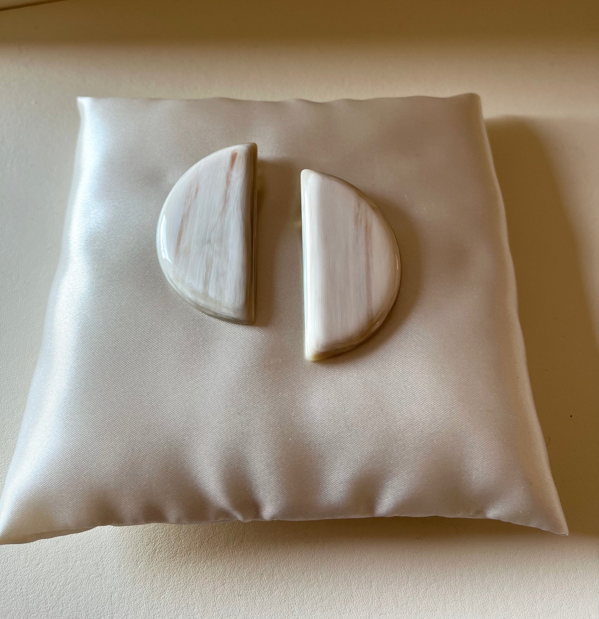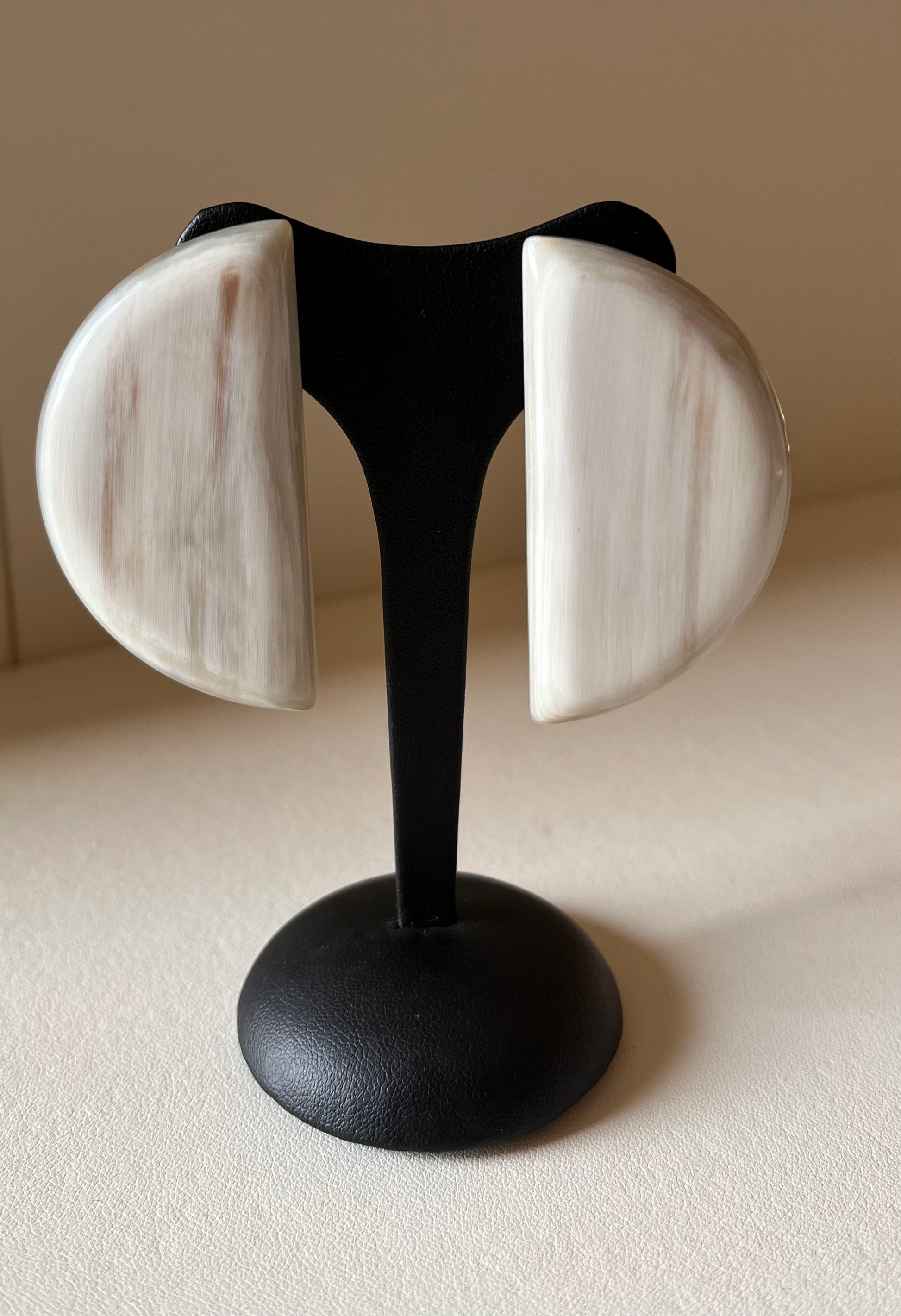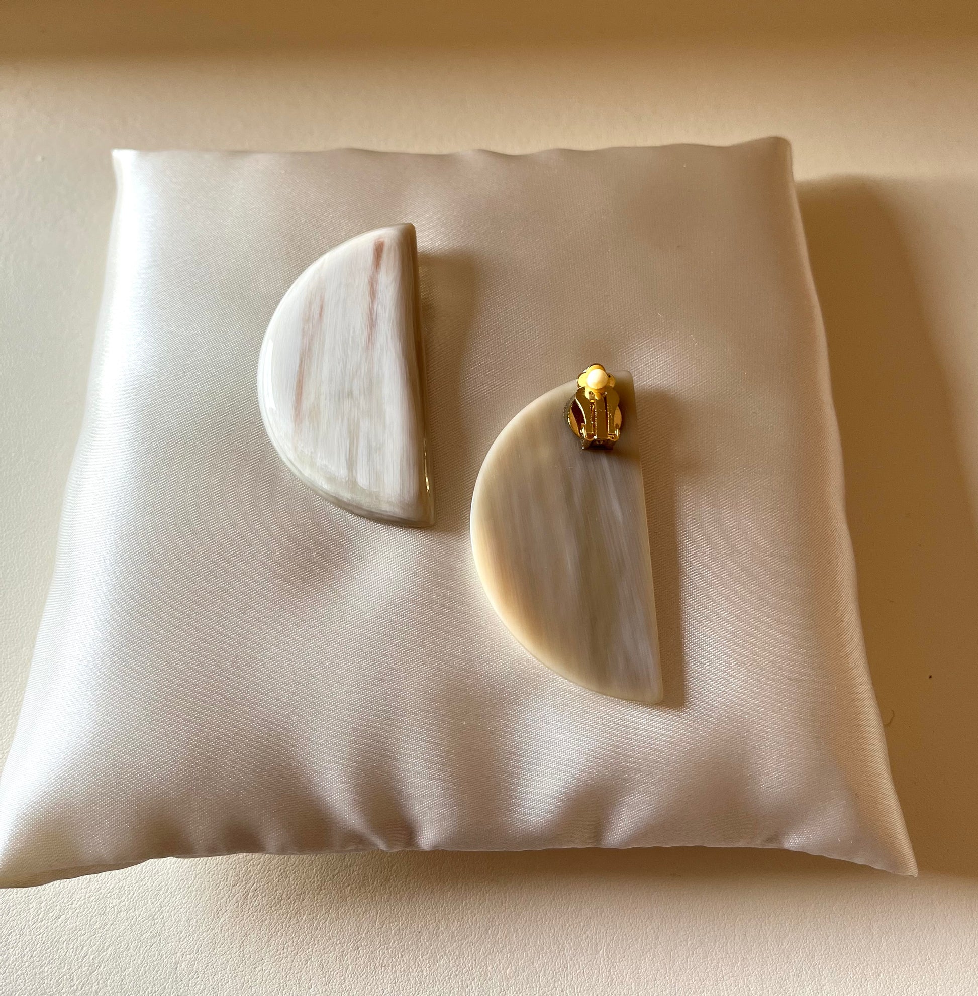 A pair of half-moon white horn earrings. A convenient clip closure makes them perfect for any occasion.