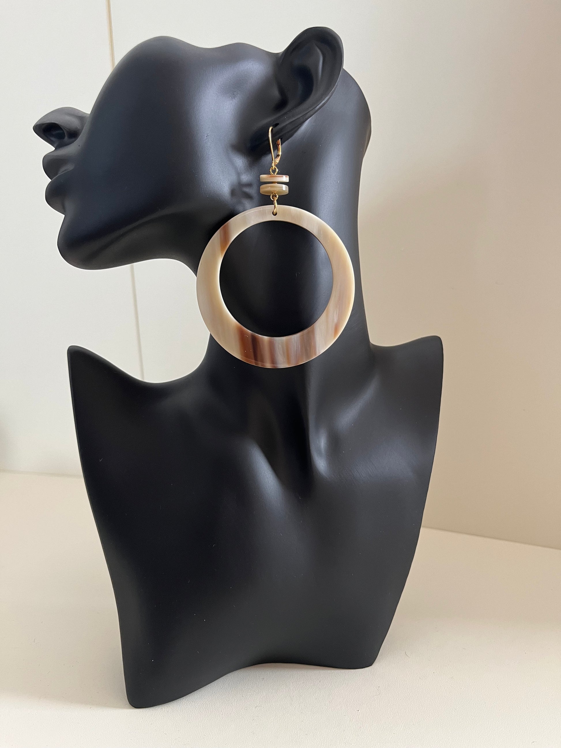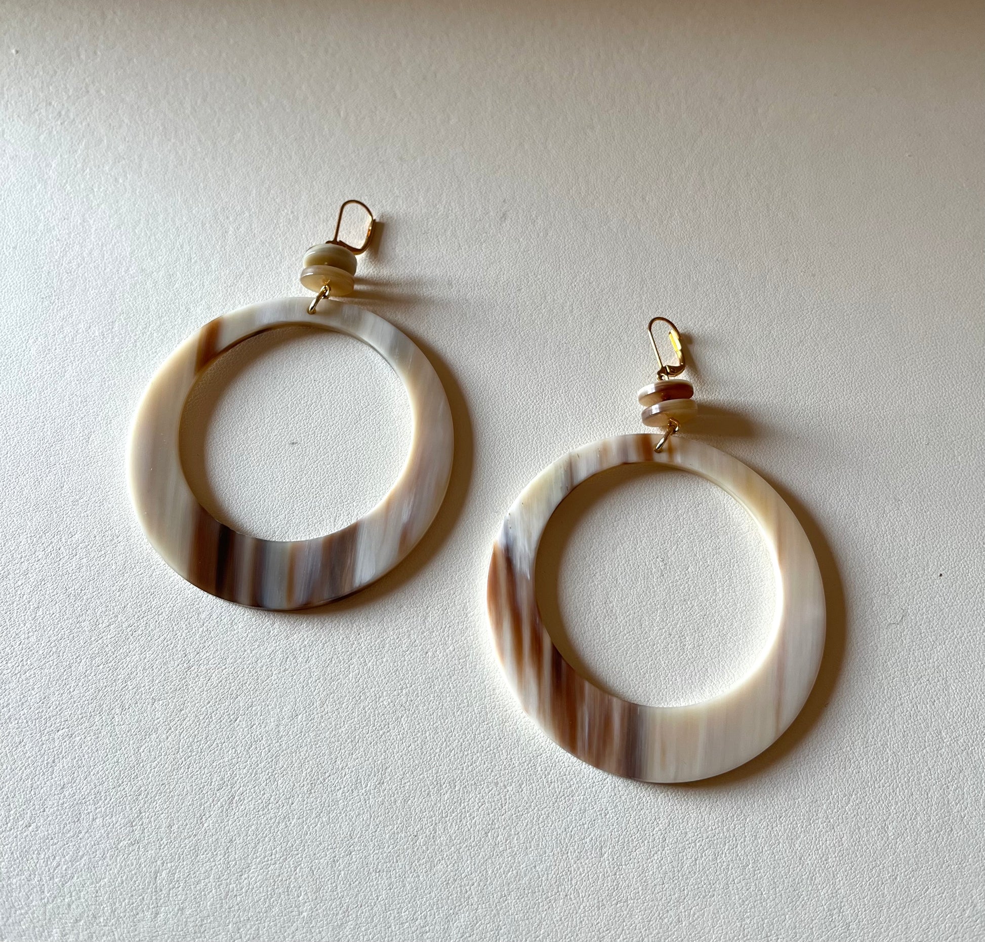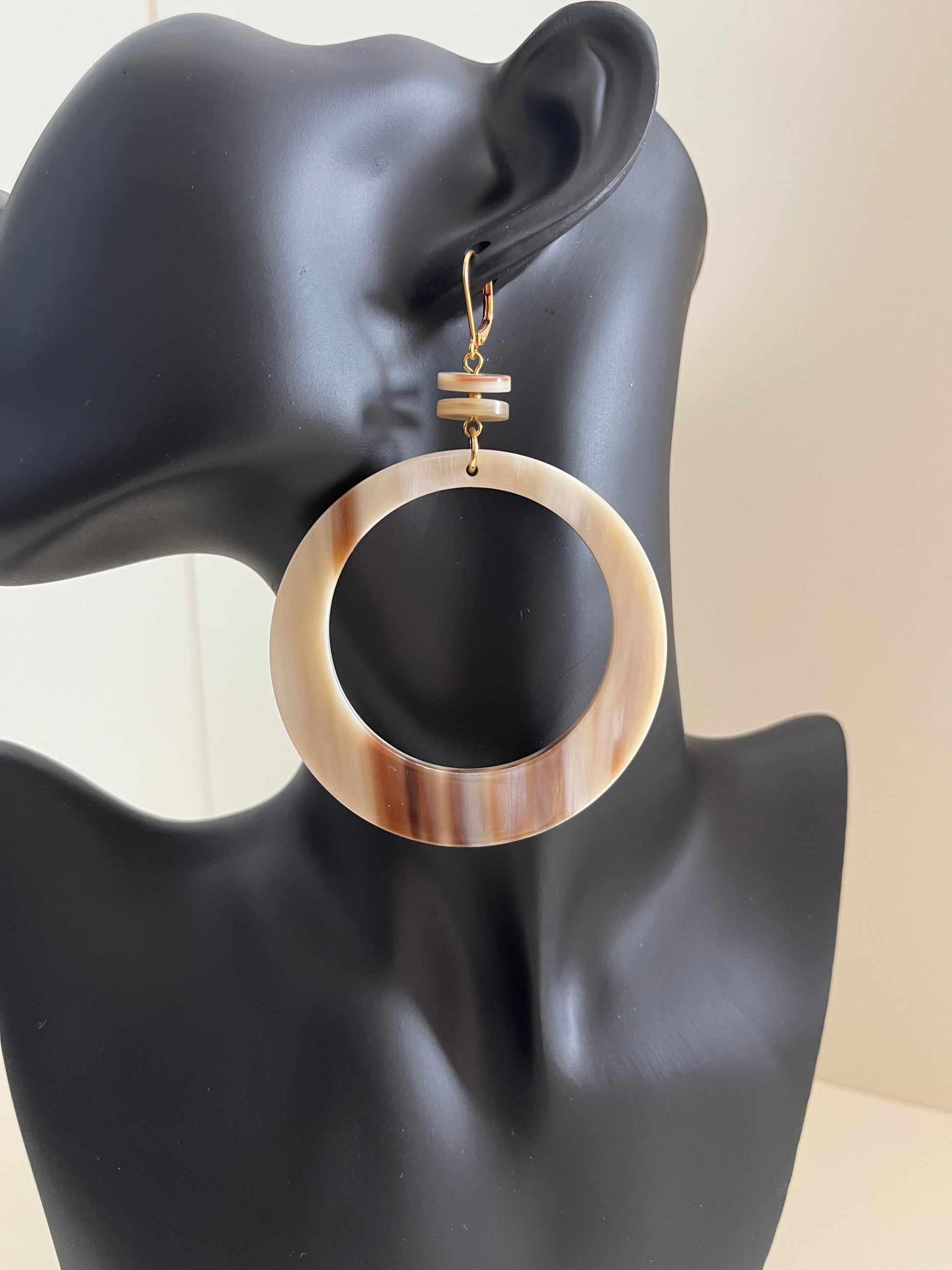 Coppia di orecchini a cerchio con piccoli bottoncini, corno naturale biondo venato.