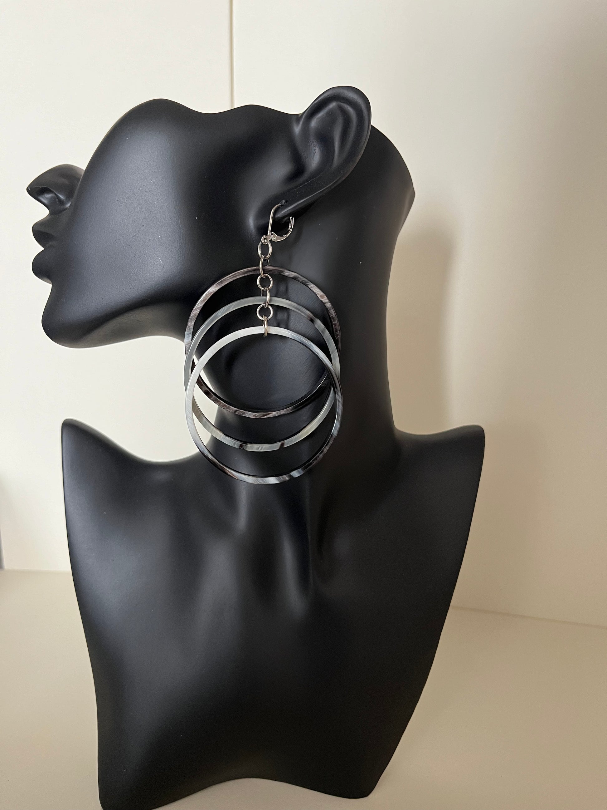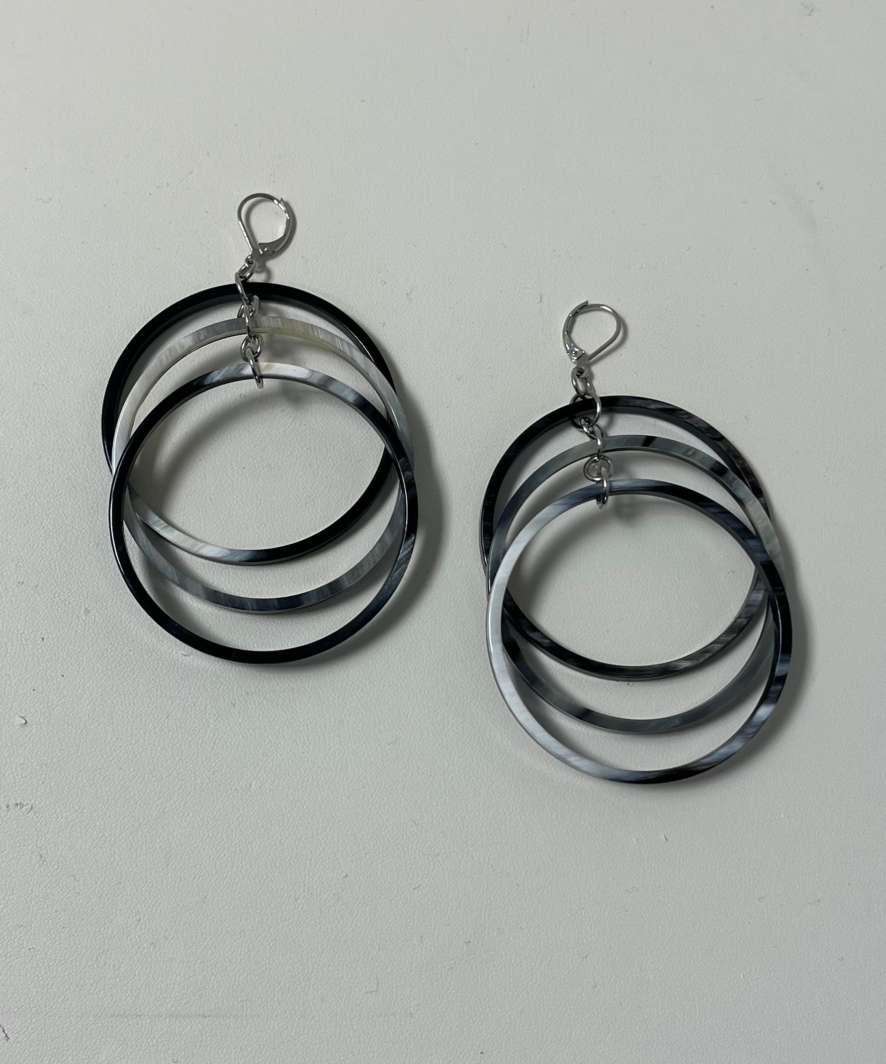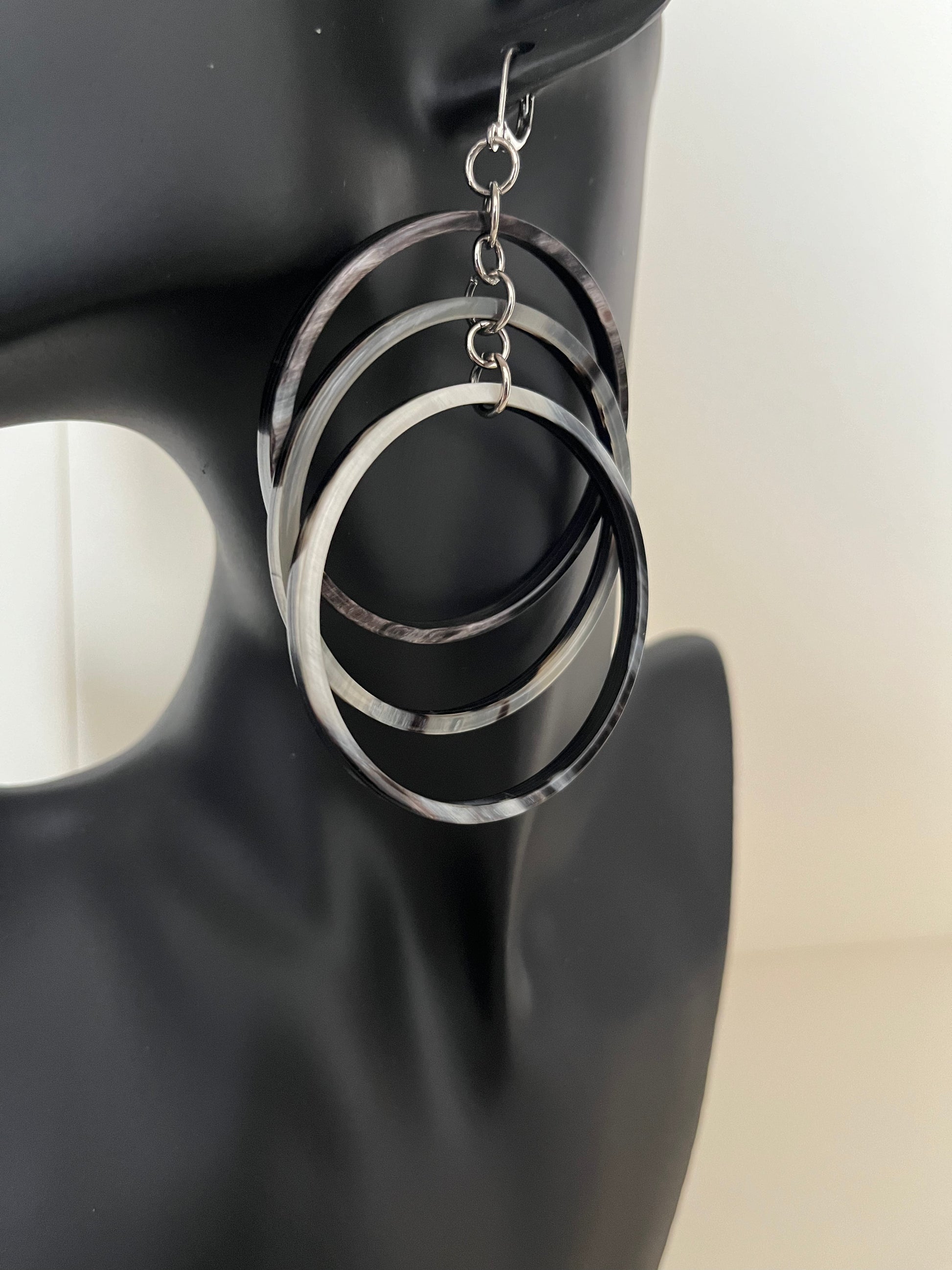 Coppia di orecchini pendenti composta da tre cerchi disposti su livelli differenti. Corno naturale bianco/nero. Eleganti e raffinati