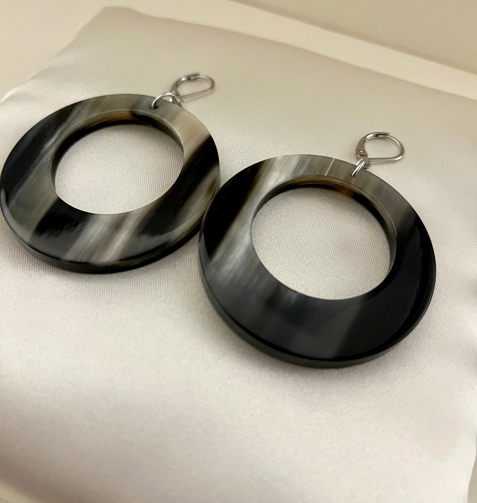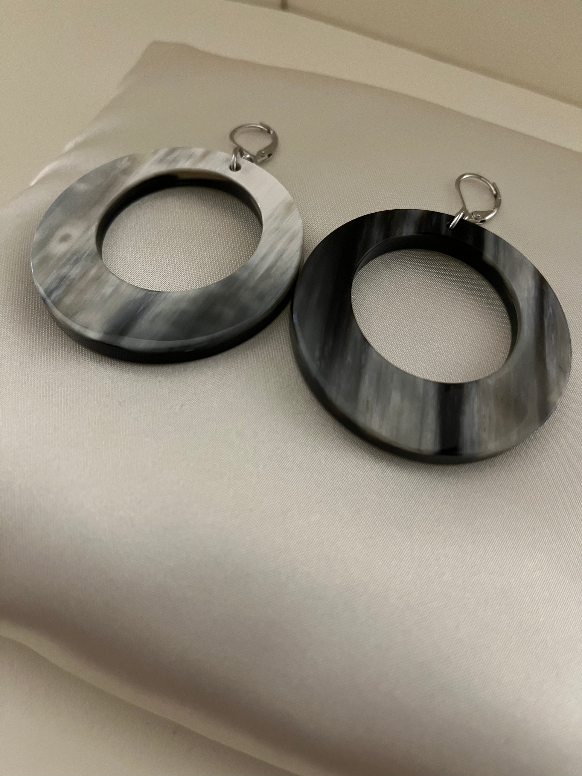 Coppia di orecchini con pendente tondo. Gioiello artigianale realizzato in corno naturale bianco nero con venature sempre differenti. La caratteristiche di venature sempre differenti dona unicità al gioiello. Leggero, versatile e adatto ad ogni occasione.