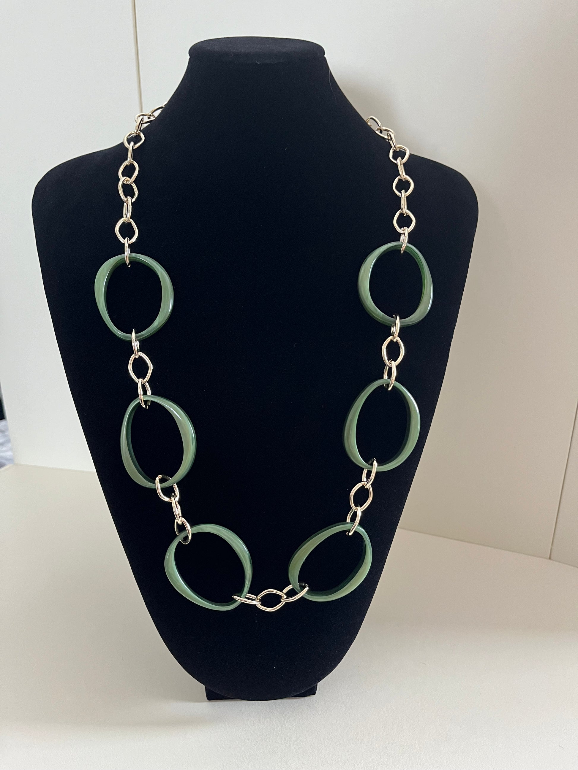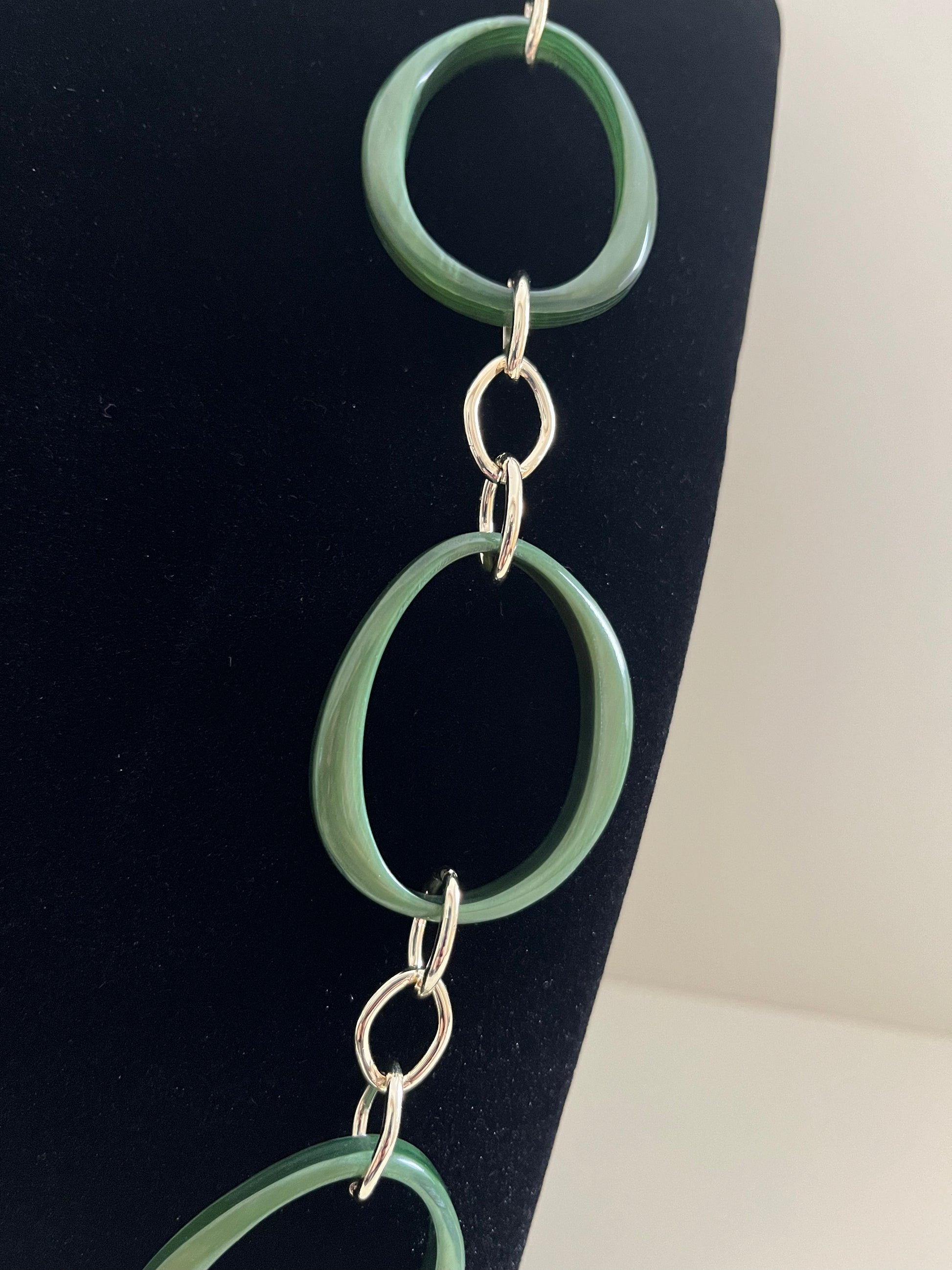 Collana composta in ottone con galvanica color oro, alternata da ovali irregolari di corno bovino tinto verde oliva.