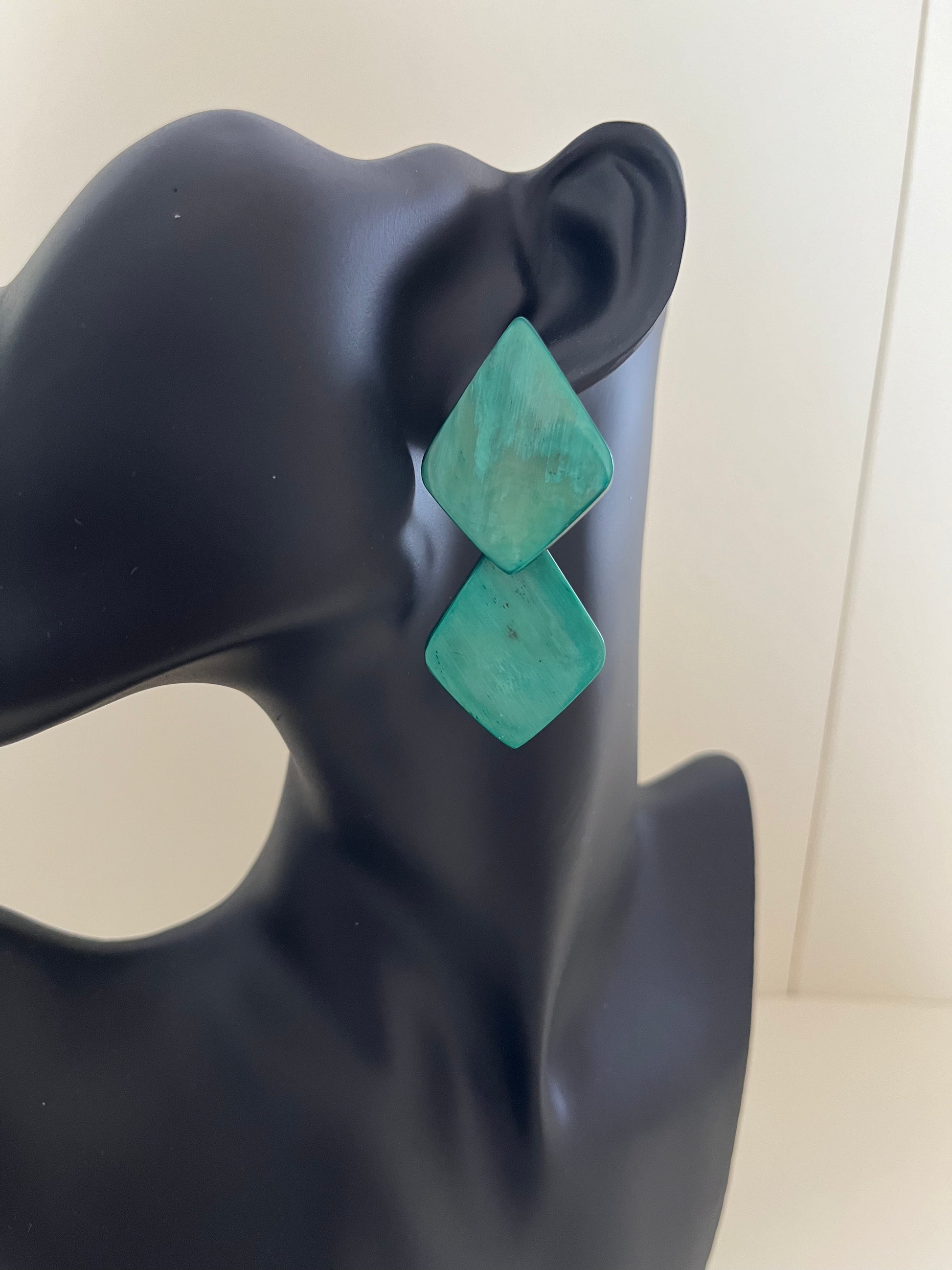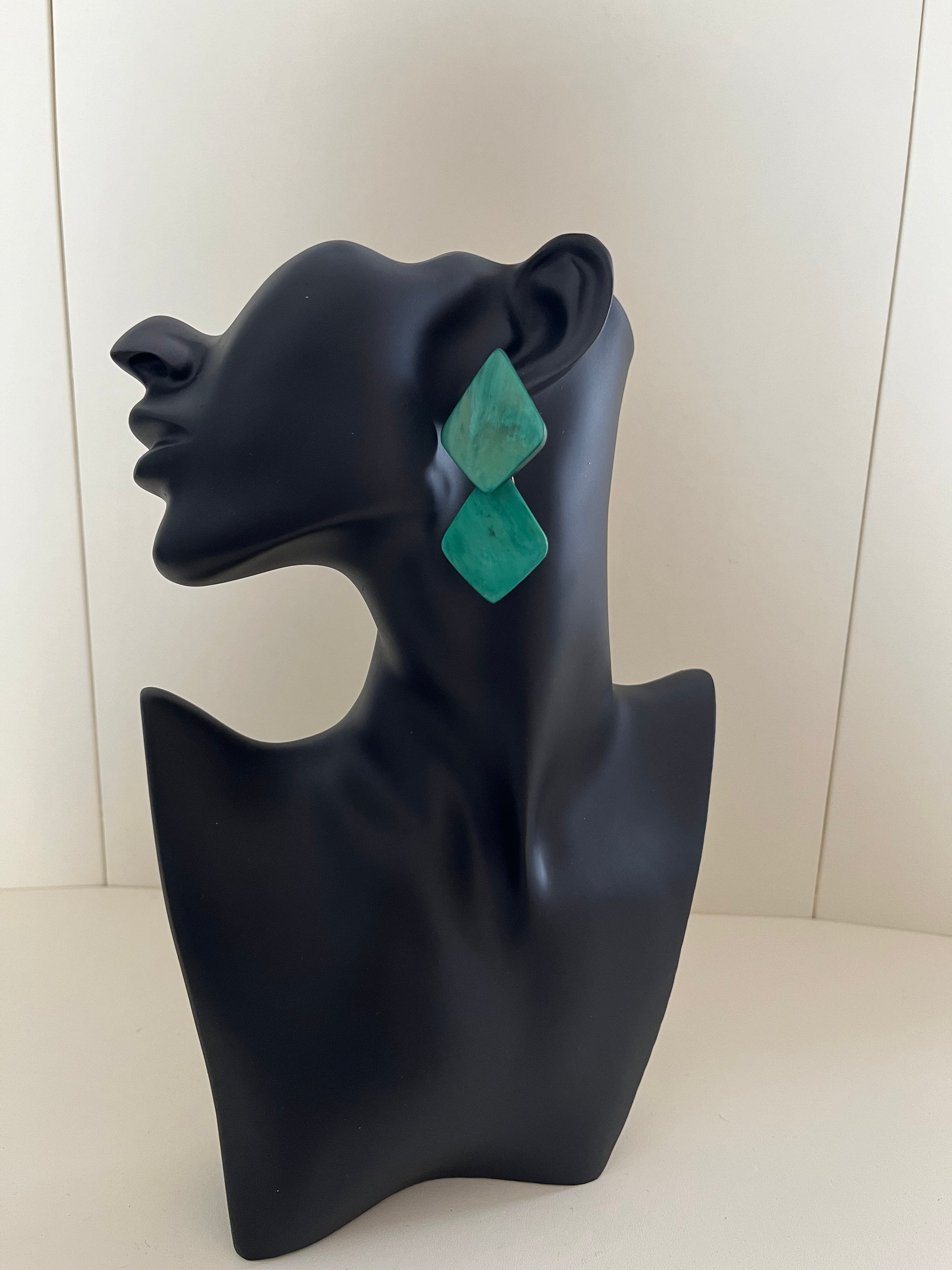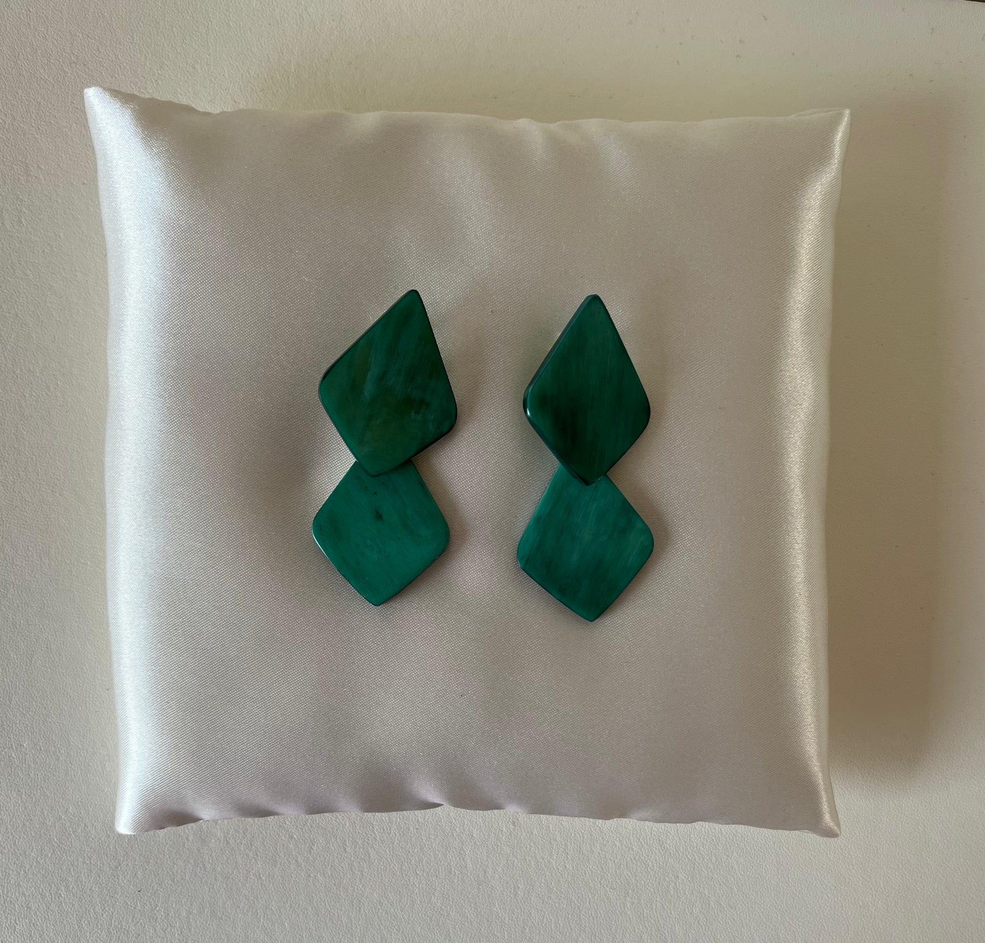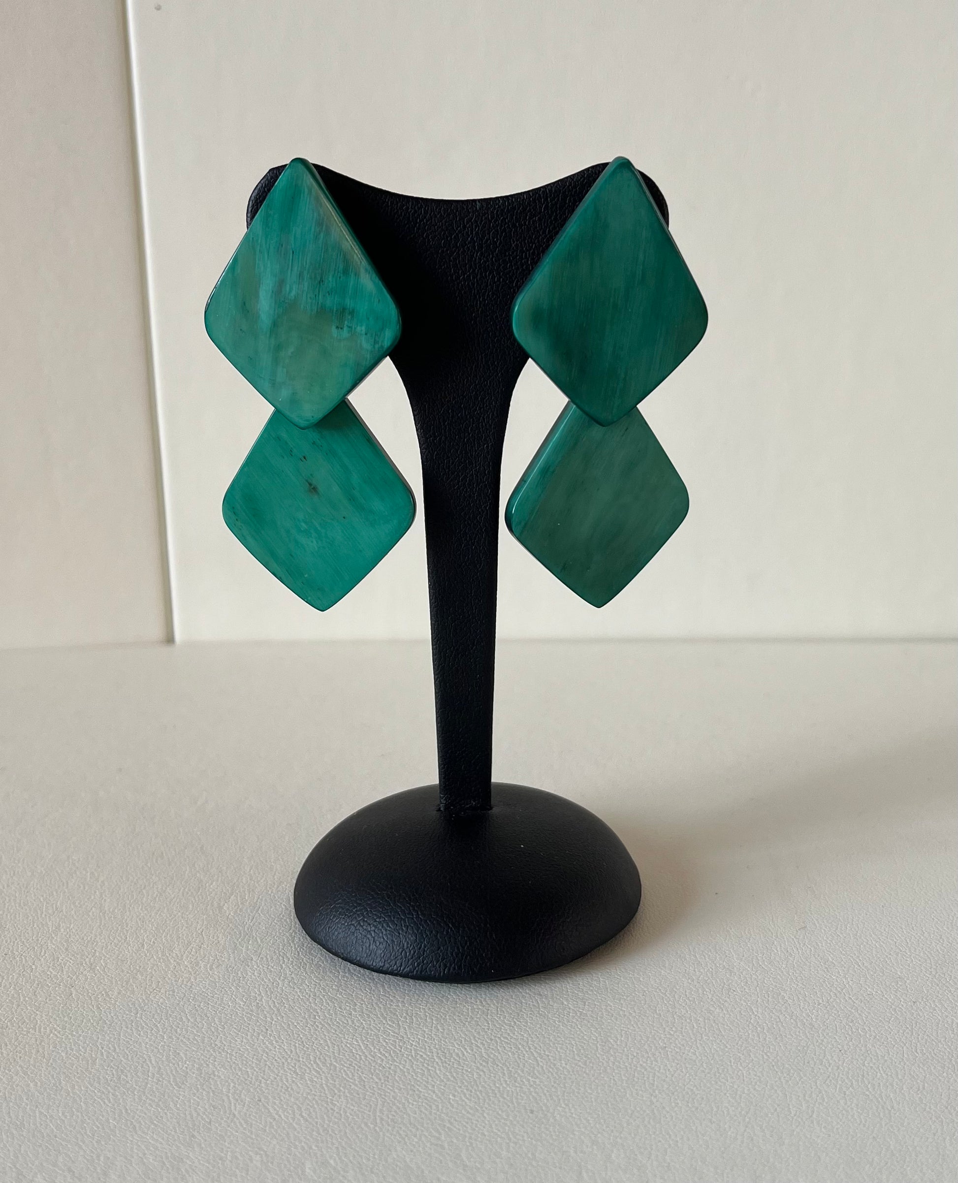 Coppia di orecchini pendenti composti da due rombi sovrapposti. Corno naturale di bovino africano tinto di verde.