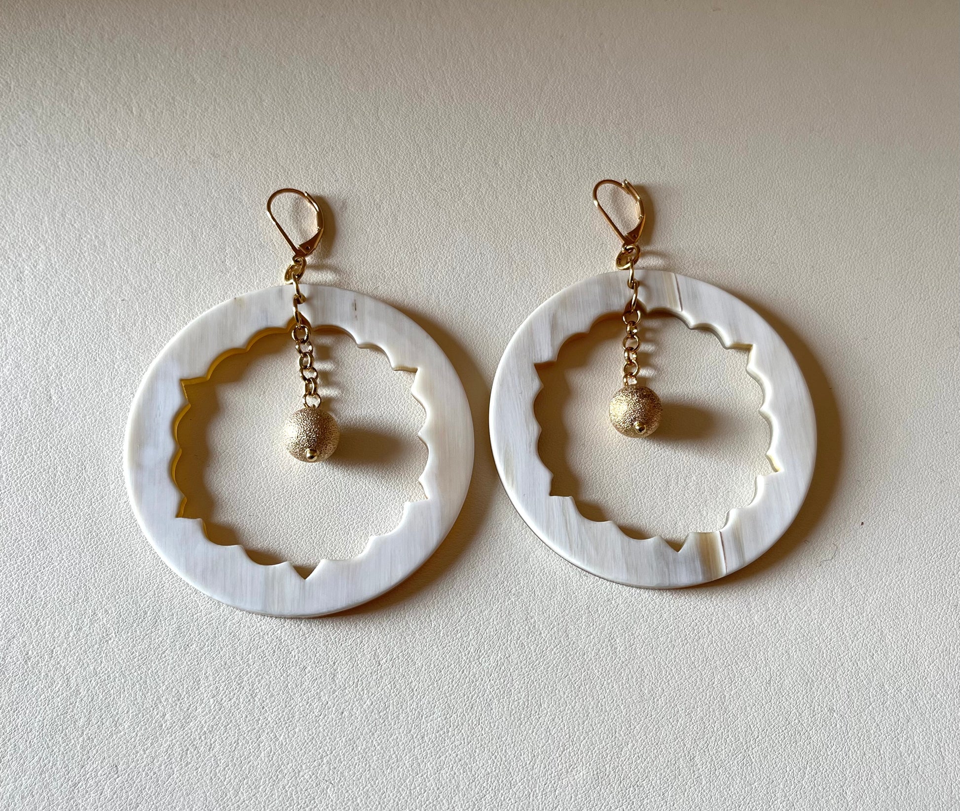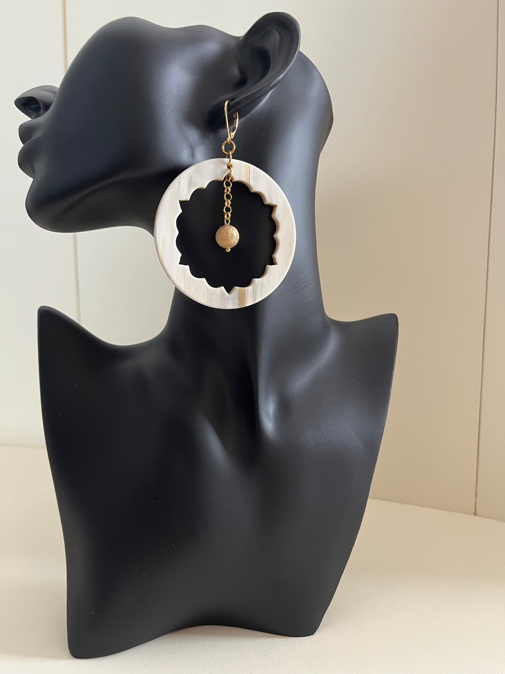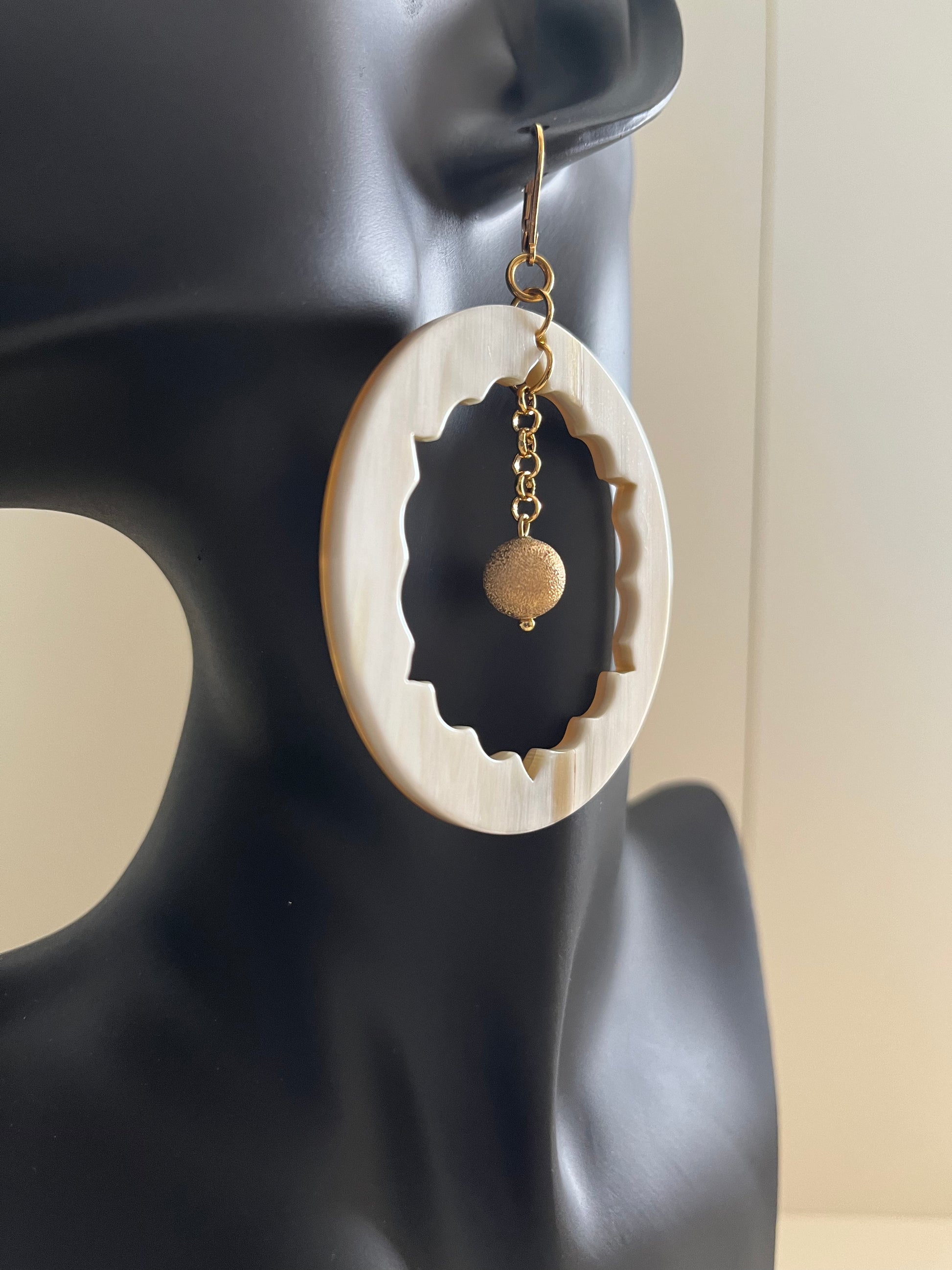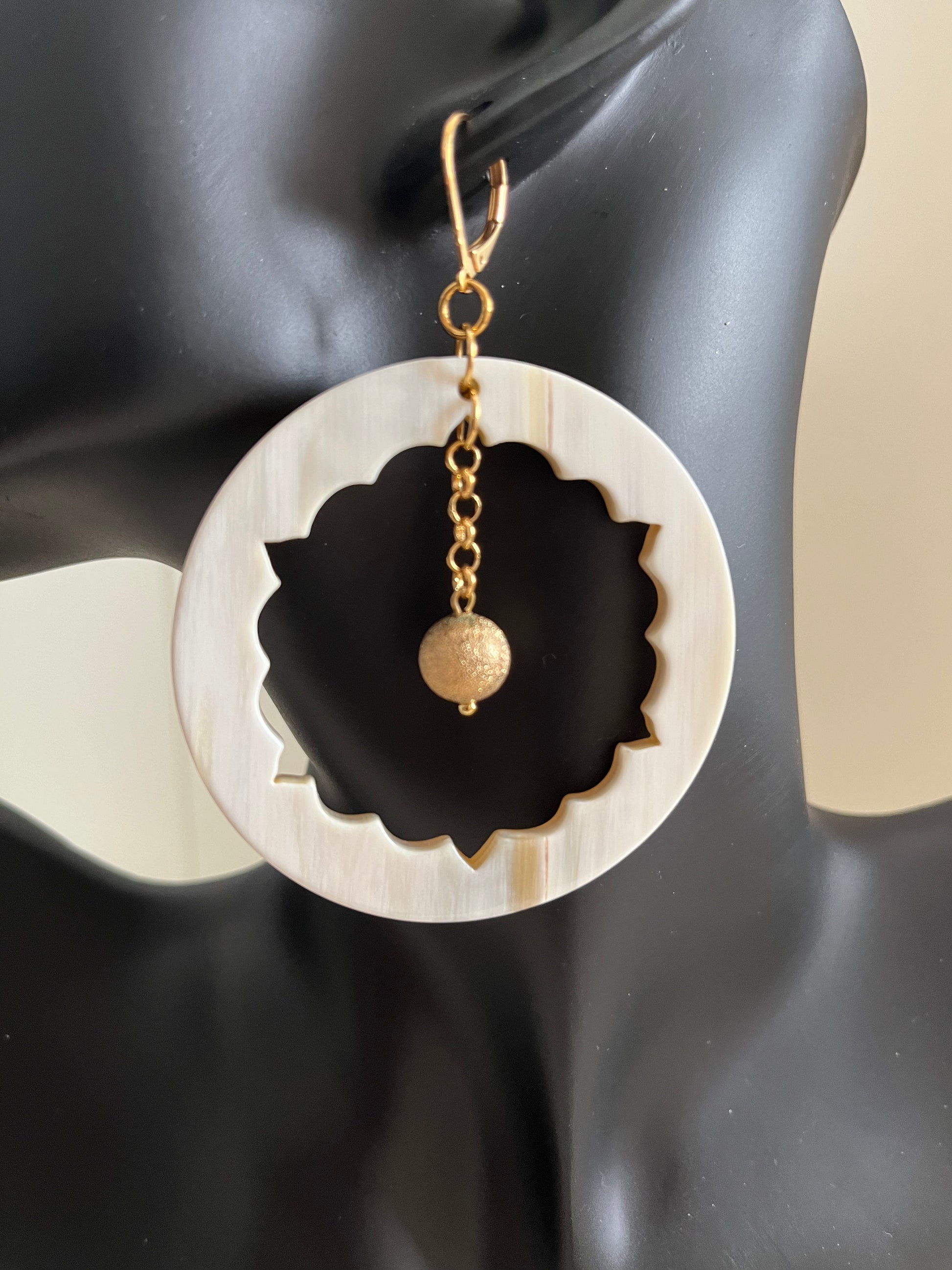 Coppia di orecchini con pendente tondo e pietra dorata al centro. Gioiello artigianale realizzato in corno naturale bianco con venature. Leggero, versatile e unico.