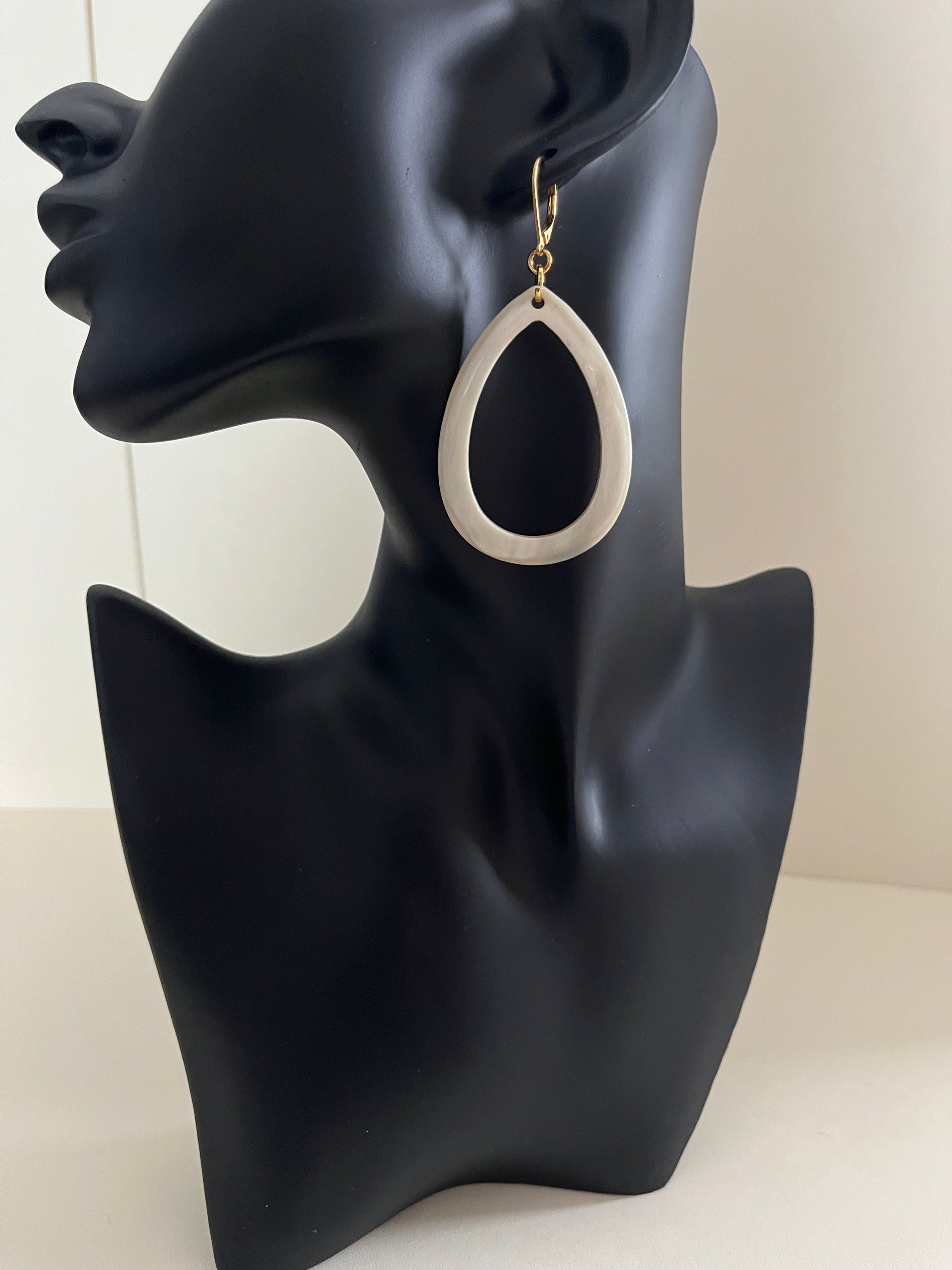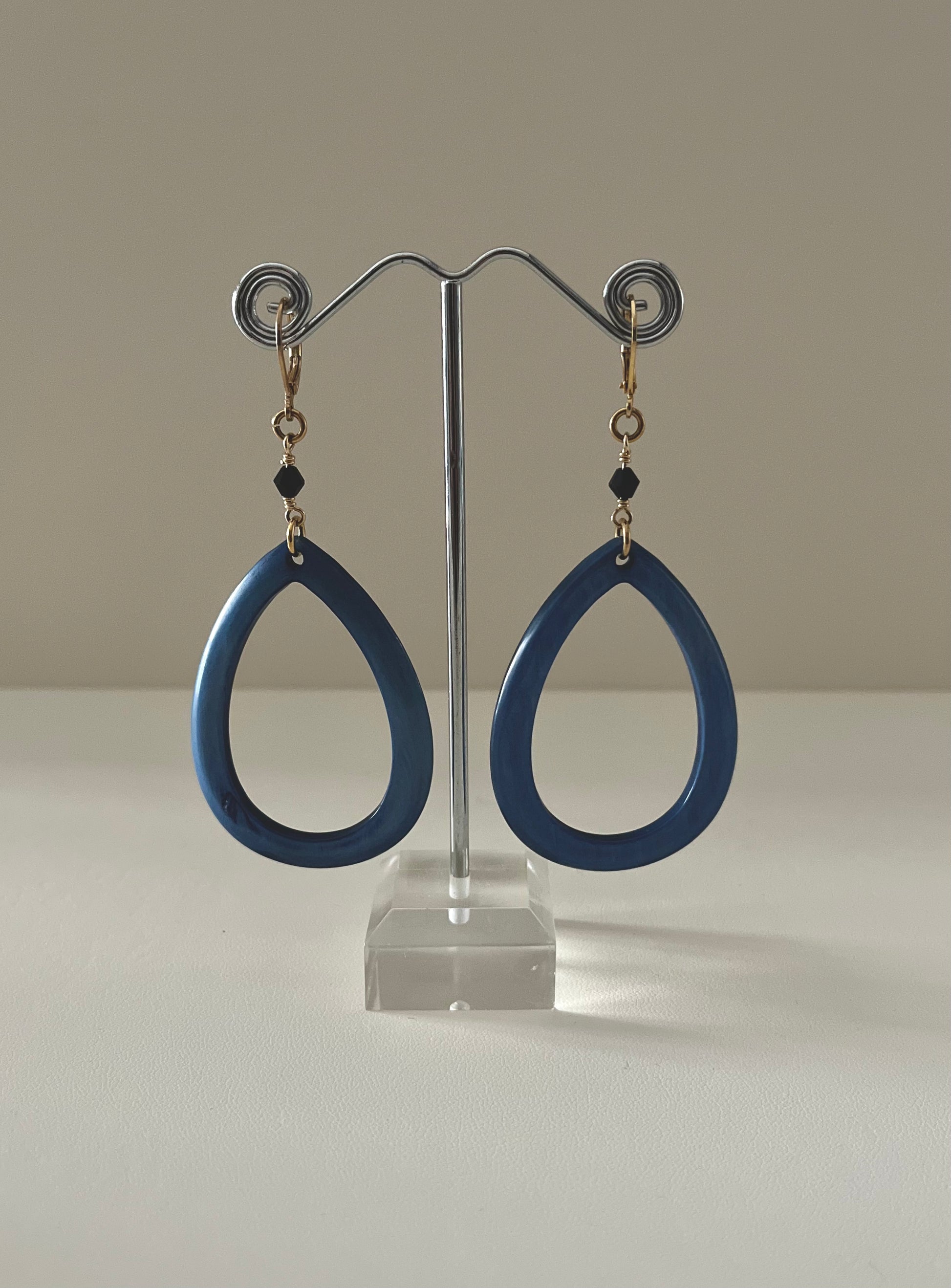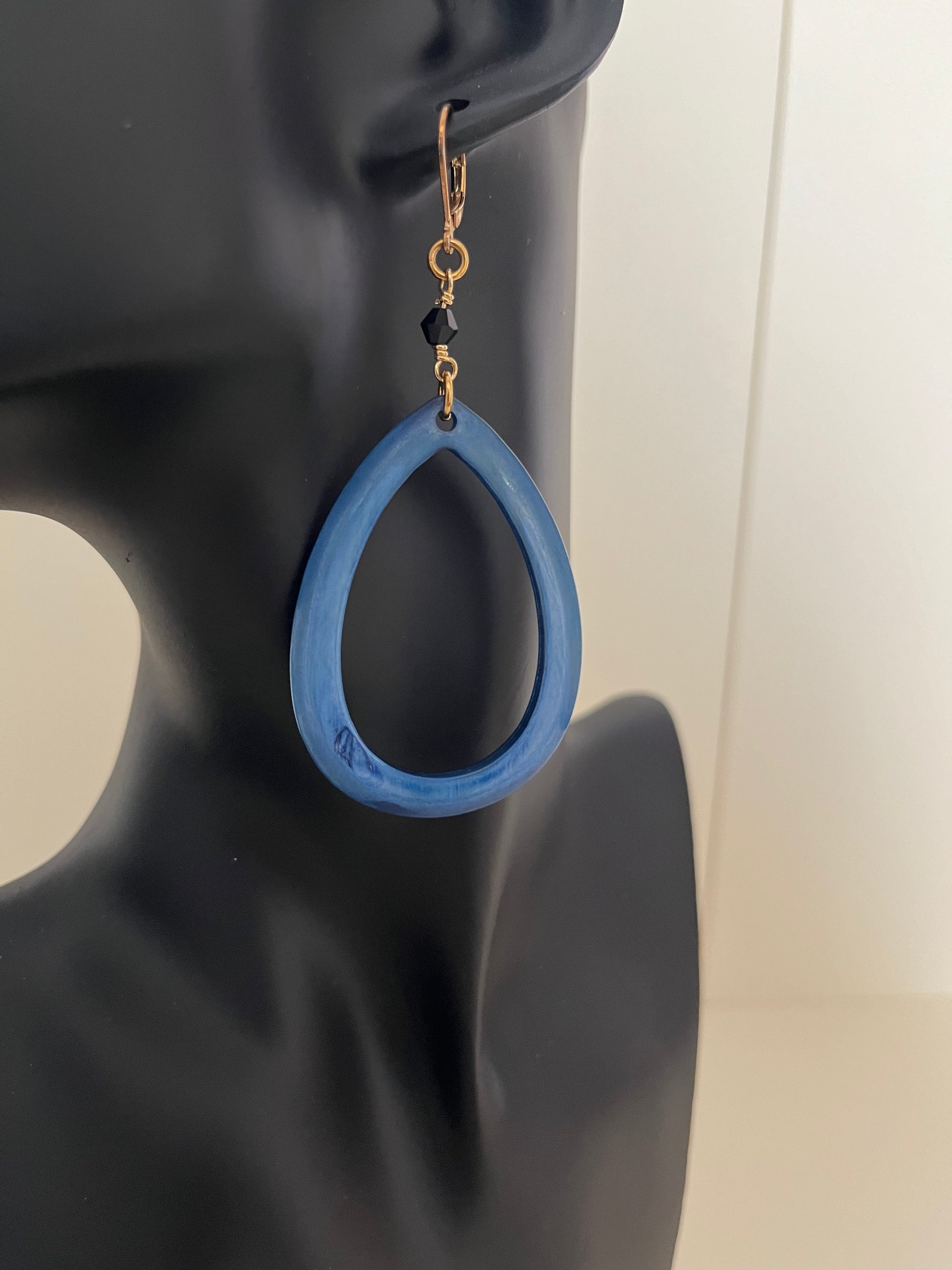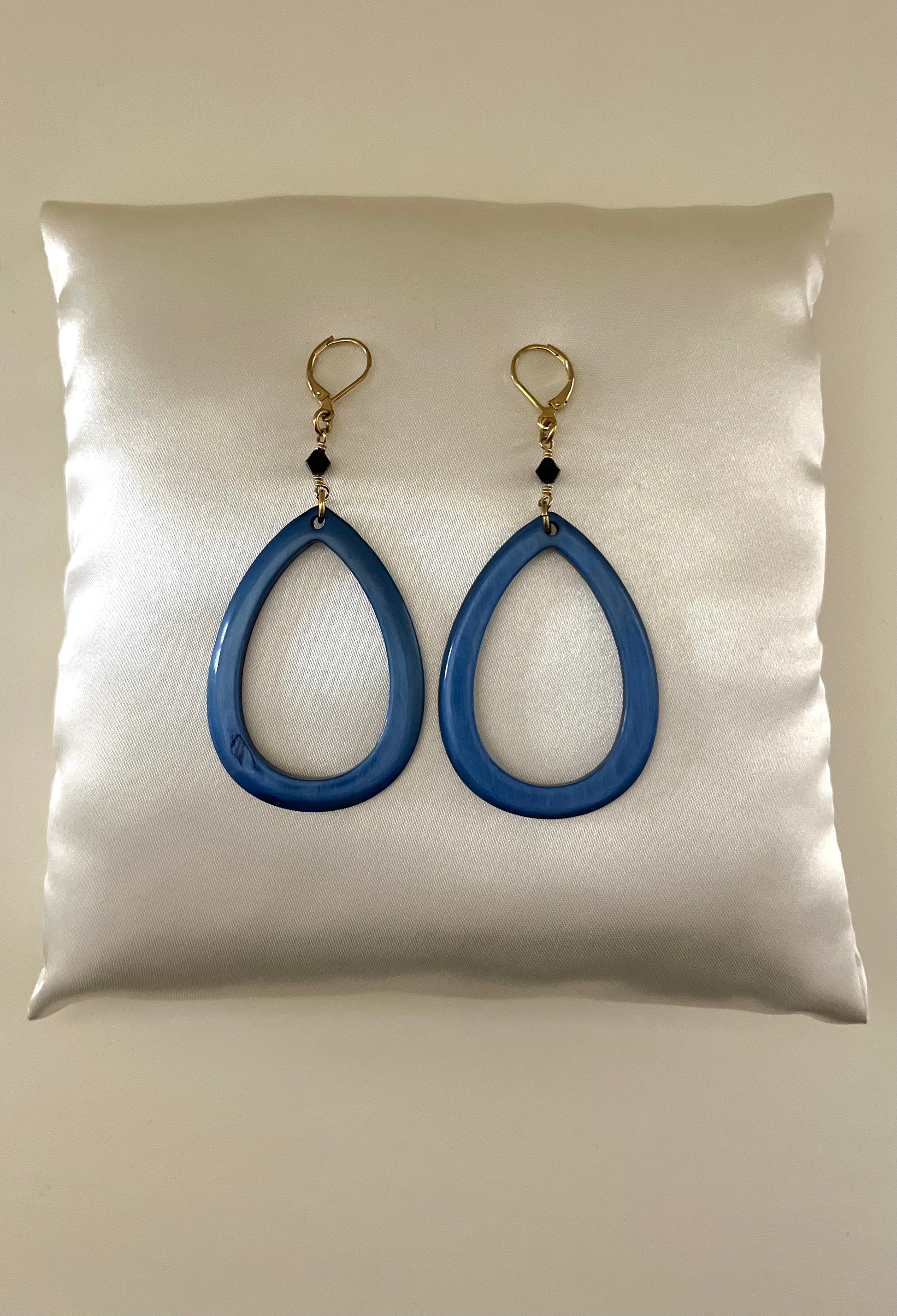 Coppia di orecchini con pendente a goccia realizzati in corno naturale tinto di azzurro. Impreziositi da una perlina blu che dona raffinatezza ed eleganza. Gioiello artigianale e unico nel suo genere.
