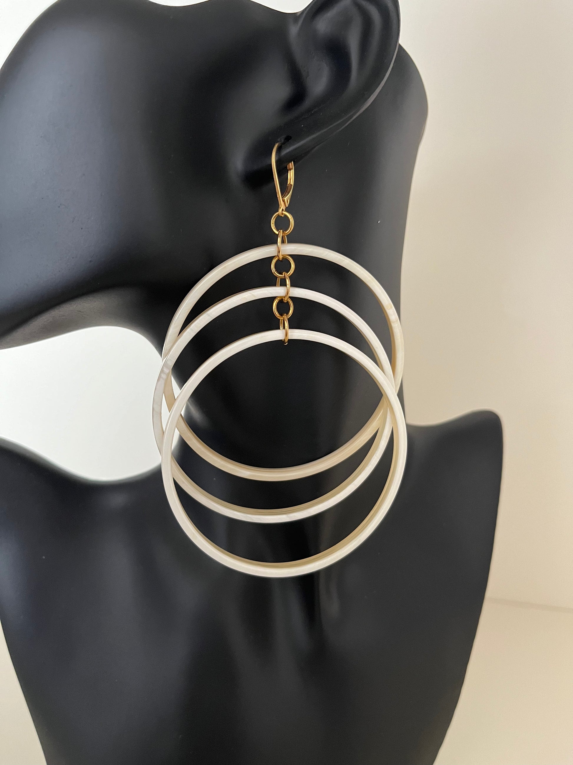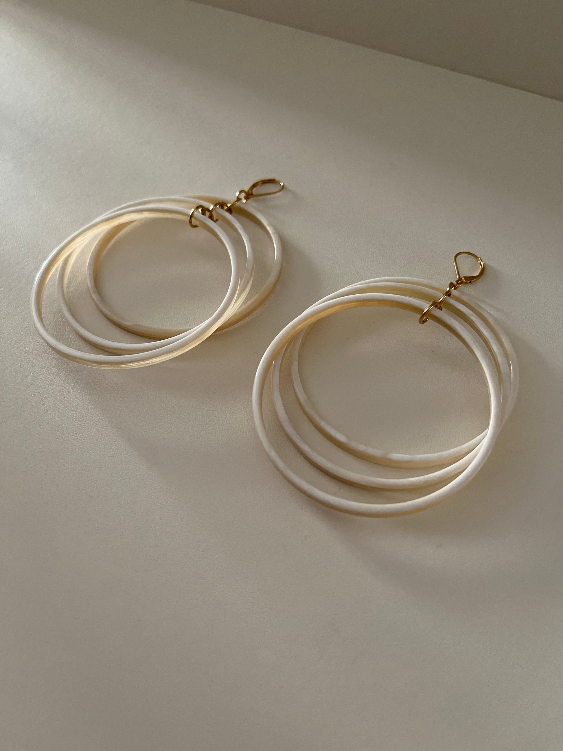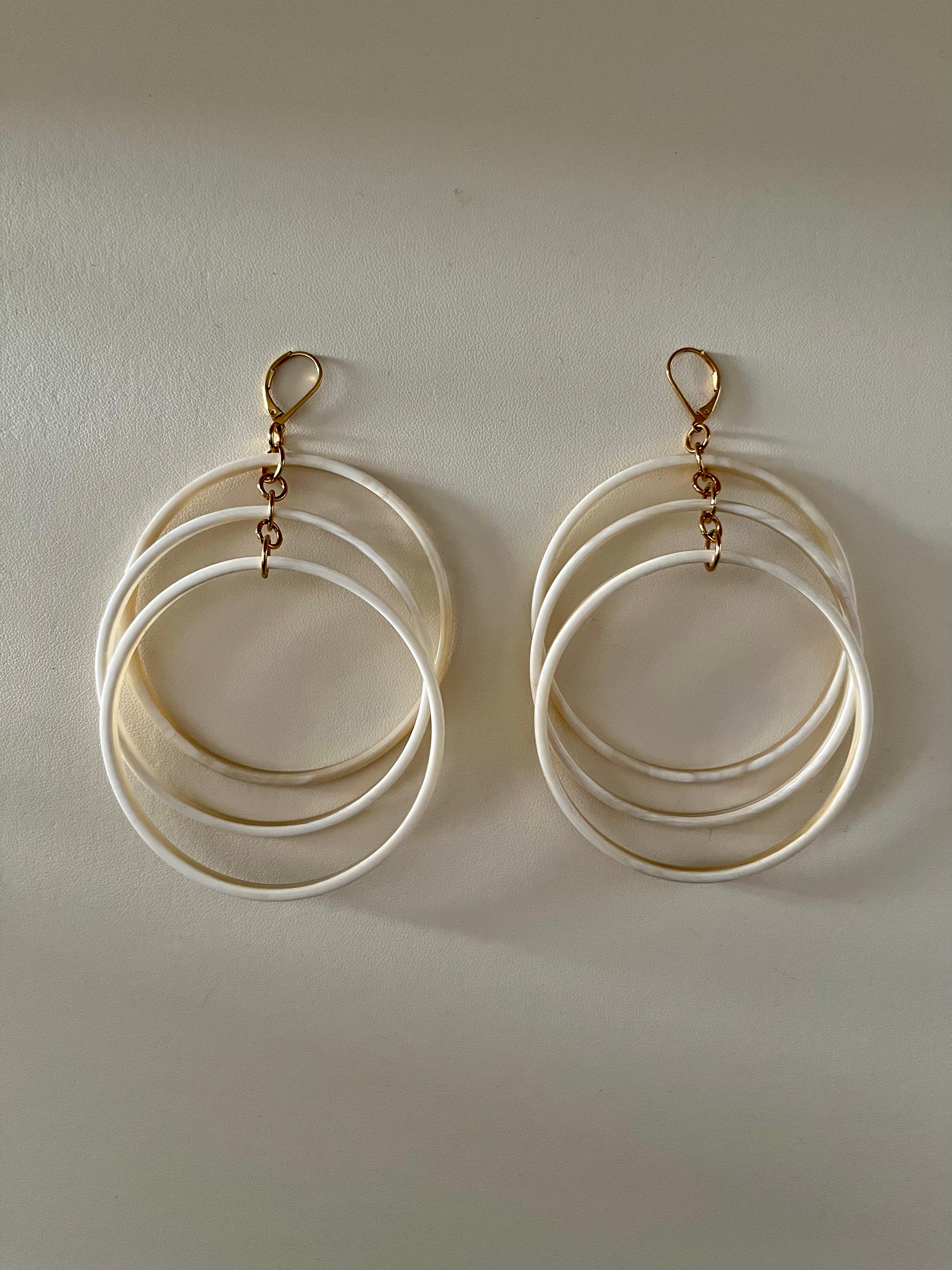 Coppia di orecchini formata da tre cerchi disposti su livelli differenti. Gioiello artigianale realizzato in corno naturale di colore bianco.