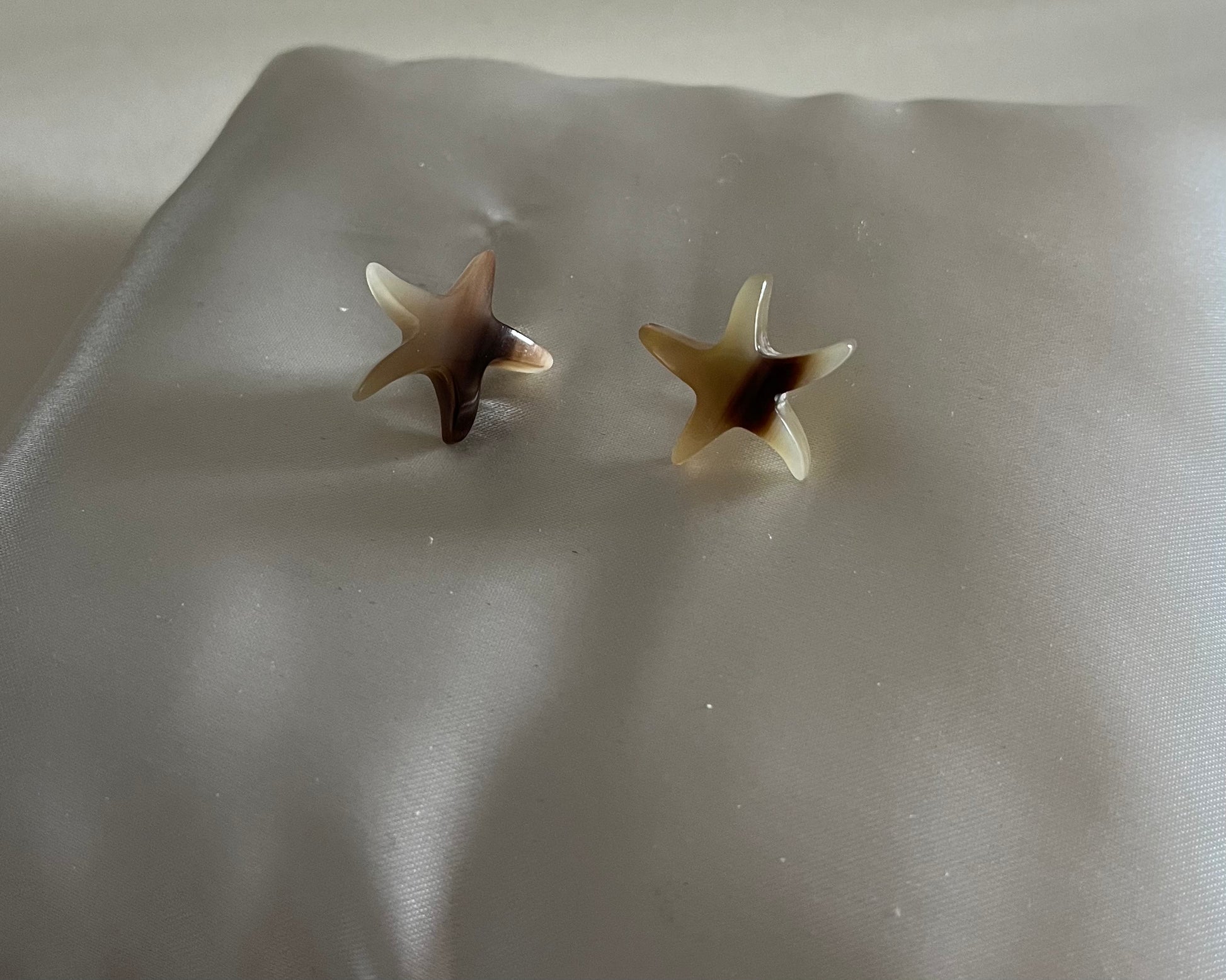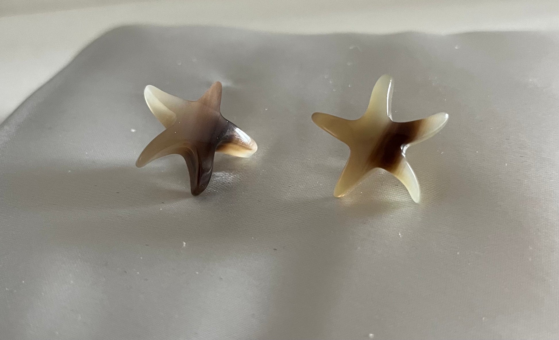 Coppia di orecchini stella marina ricavati dalla punta del corno di bovino. Prodotti artigianalmente e unici nel loro genere. Corno naturale biondo venato.